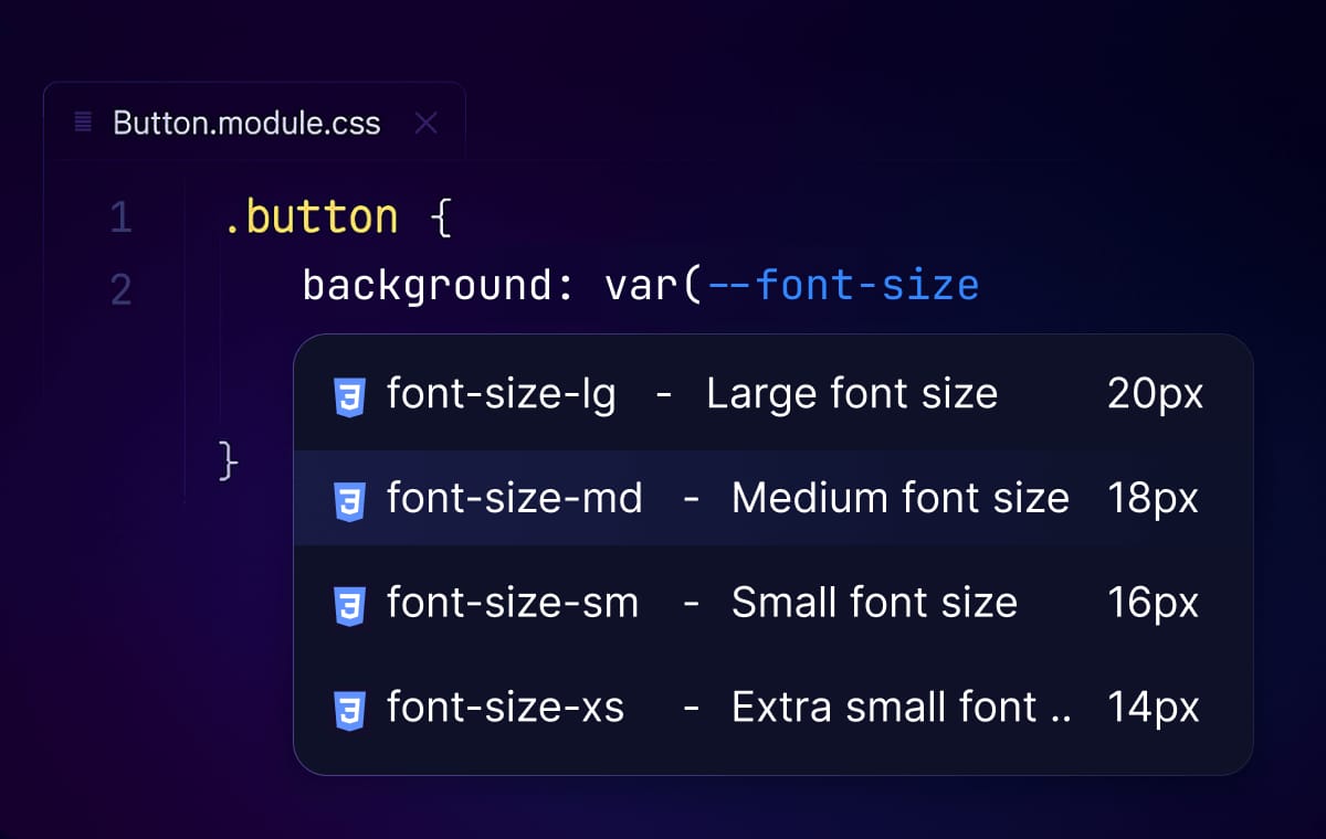 Button.module.css1.button {2font-size: var(font-size-lg- Large font size20pxfont-size-md- Medium font size18pxfont-size-sm- Small font size16pxfont-size-xs- Extra small font ...14px3}Rich Hover Documentation